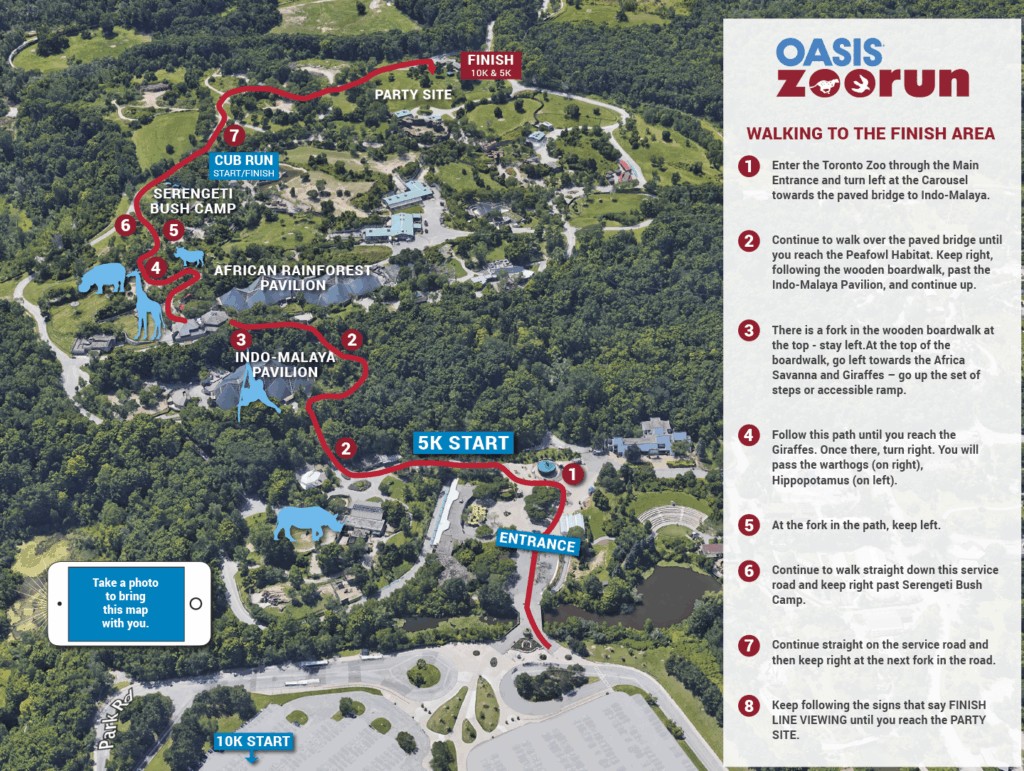 Drop-off Location: beside the 10K start line in the Toronto Zoo’s main parking lot, section E. Check your bag at the Baggage Truck.